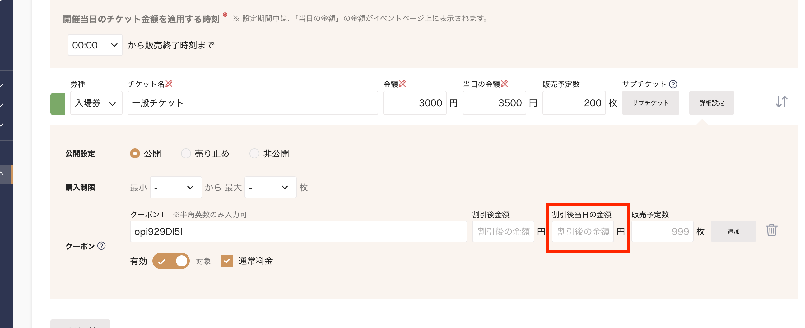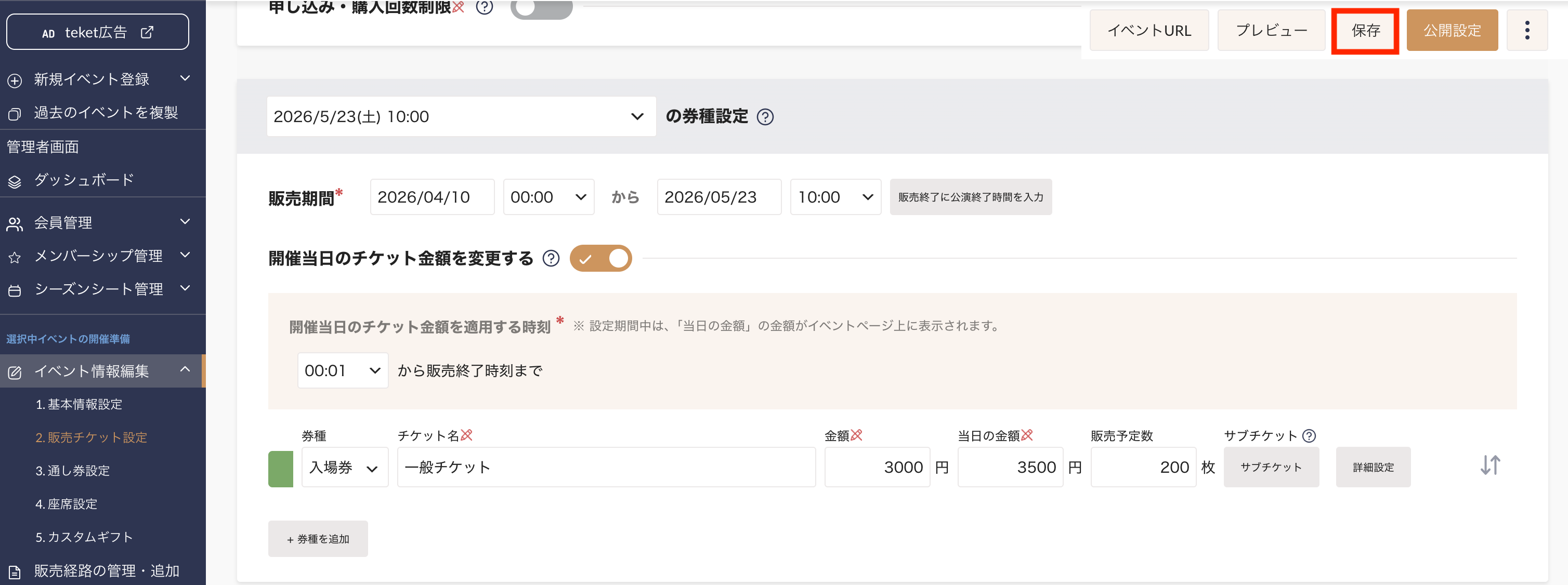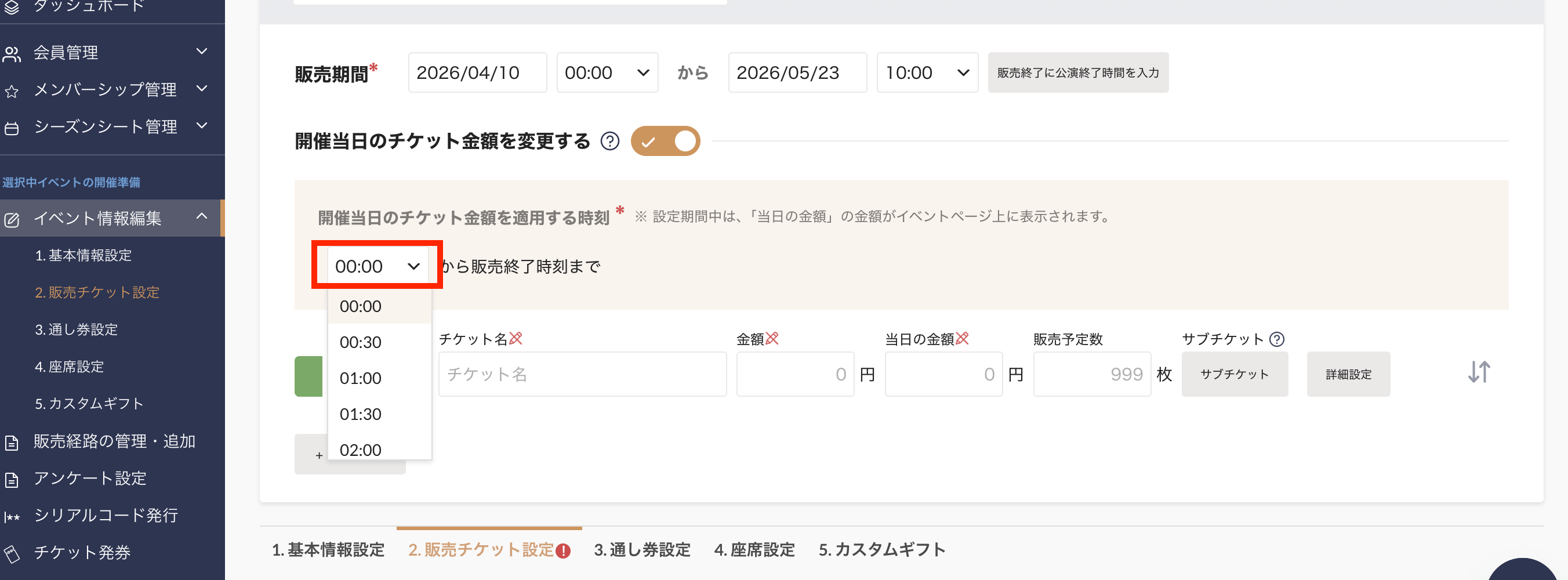 2.「開催当日のチケット金額を適用する時刻」で、開催当日の何時から当日料金を適用するか設定します