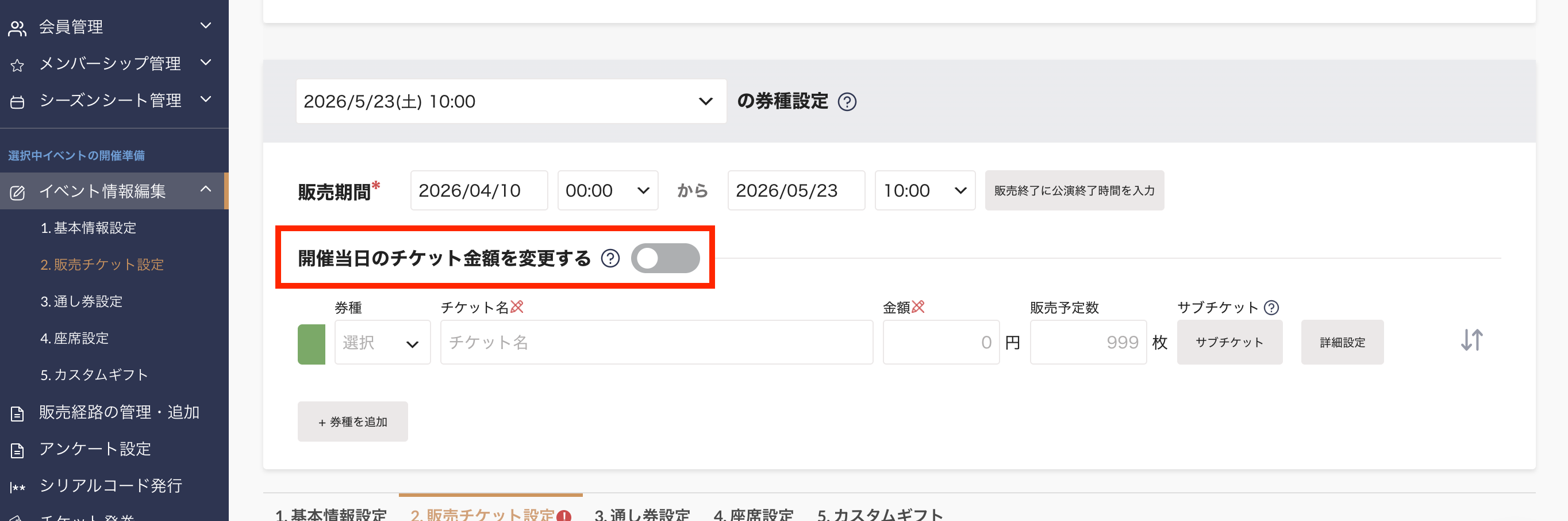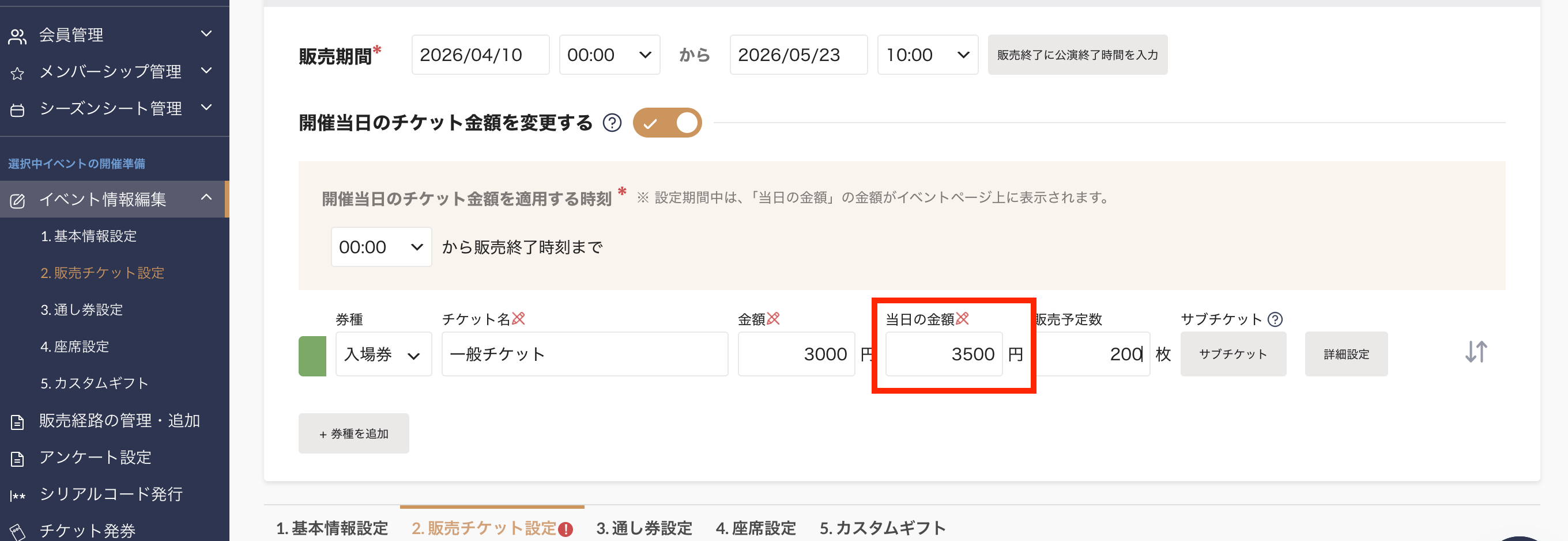 1.イベント管理ページ>イベント情報編集>2.販売チケット設定にて、「開催当日のチケット金額を変更する」を有効にします
