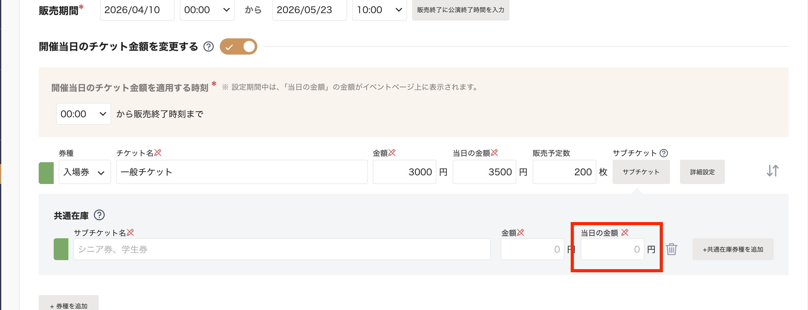 ※例.公演当日の時刻を「0:00」に設定すると、公演当日に日が変わったタイミングで当日券の料金に切り替わります。