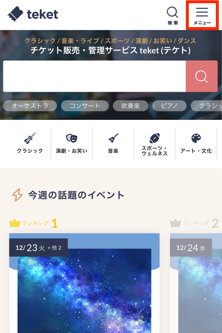 1. teketサイト右上にある「≡(メニュー)」を押します