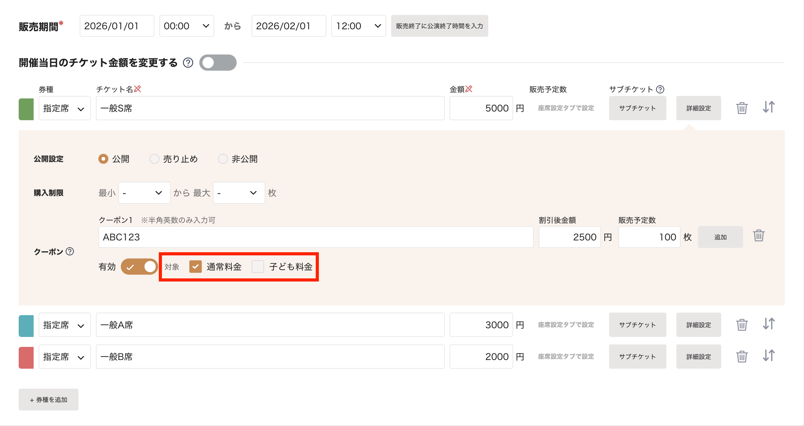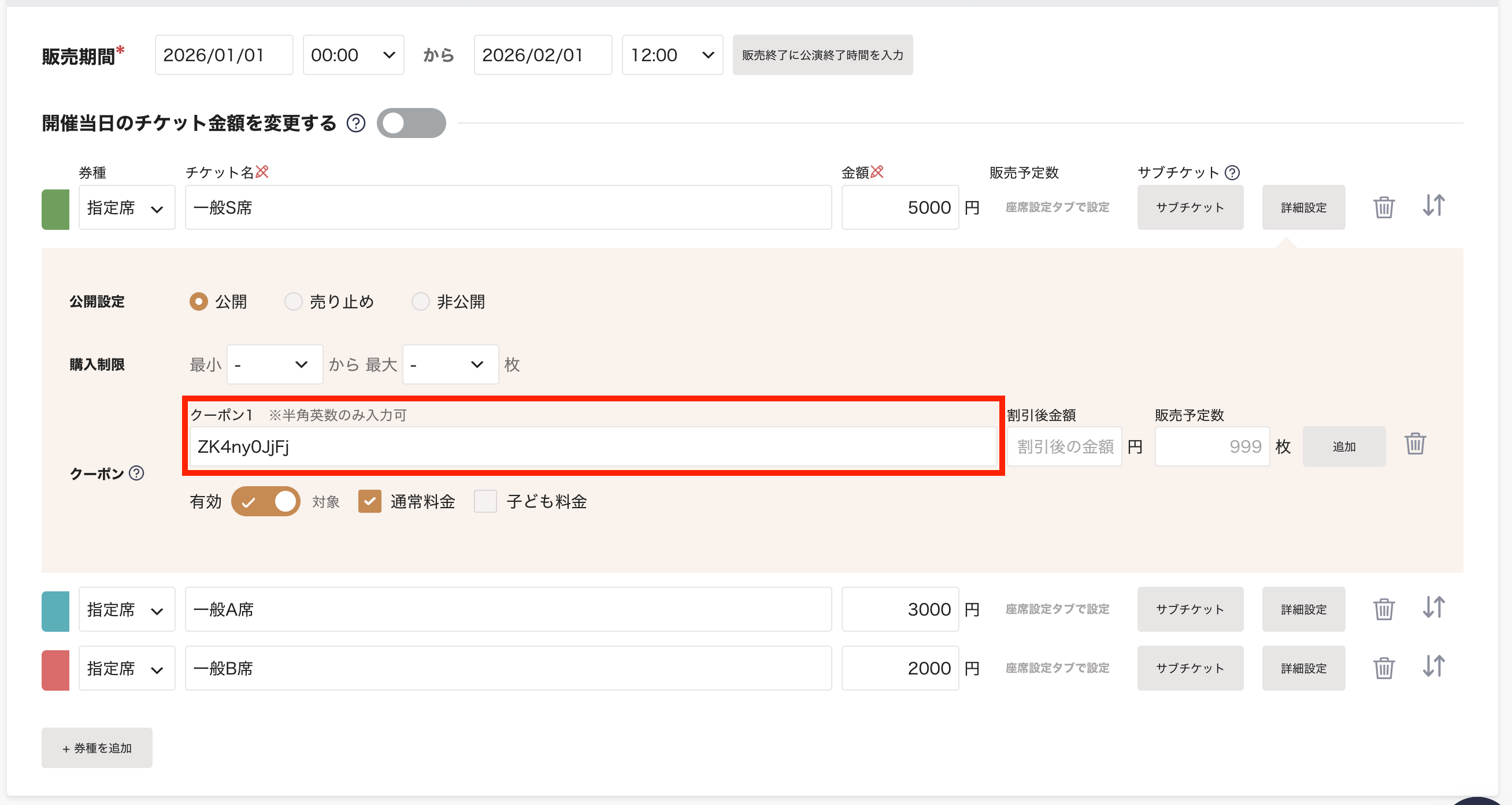 チケット購入者がクーポンコードを利用することによって、割引された料金でチケットを購入することができます。
