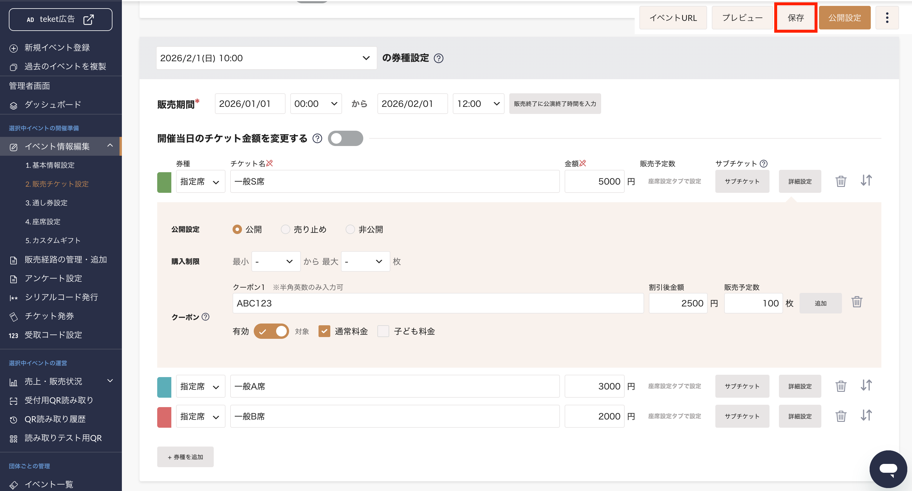 5. 割引後のチケット価格、割引するチケットの購入上限枚数を入力します
