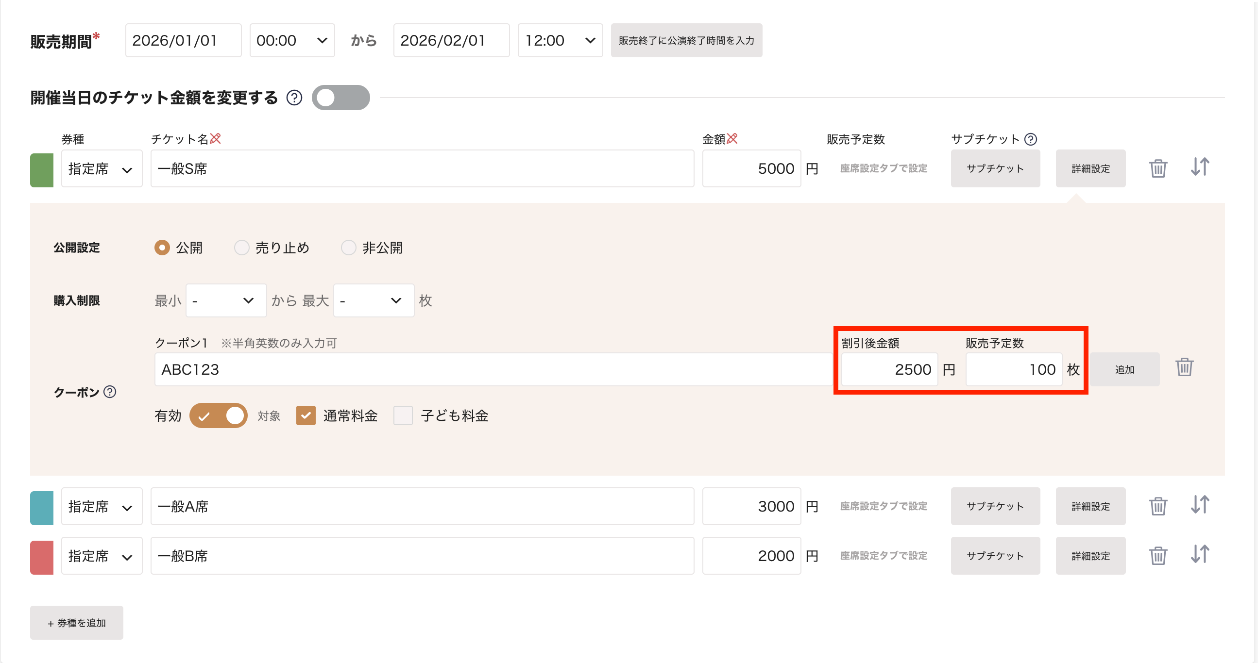 例:5000円のチケットを2500円で販売する場合は、割引後の枠に2500円と入力してください。