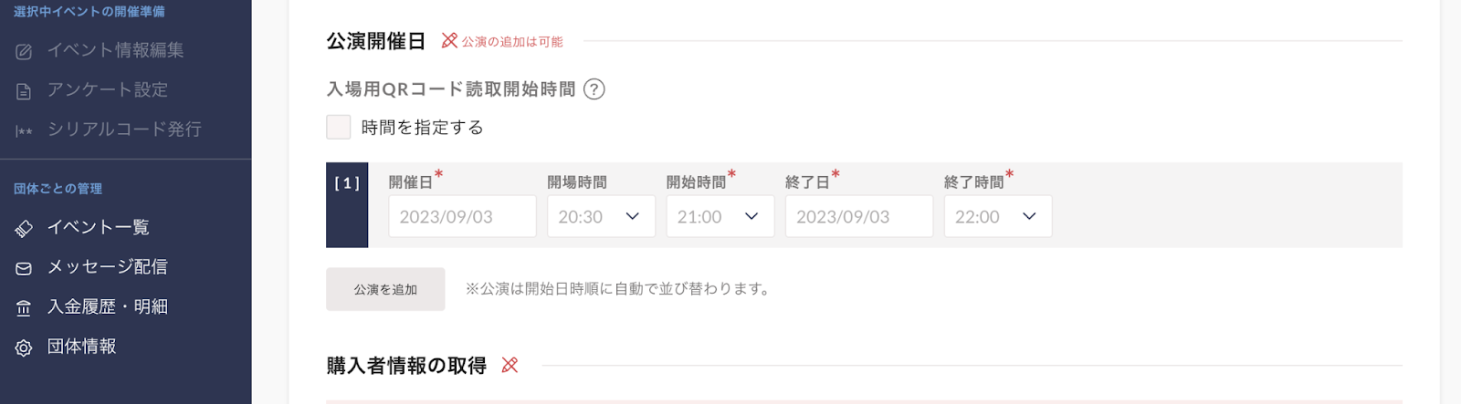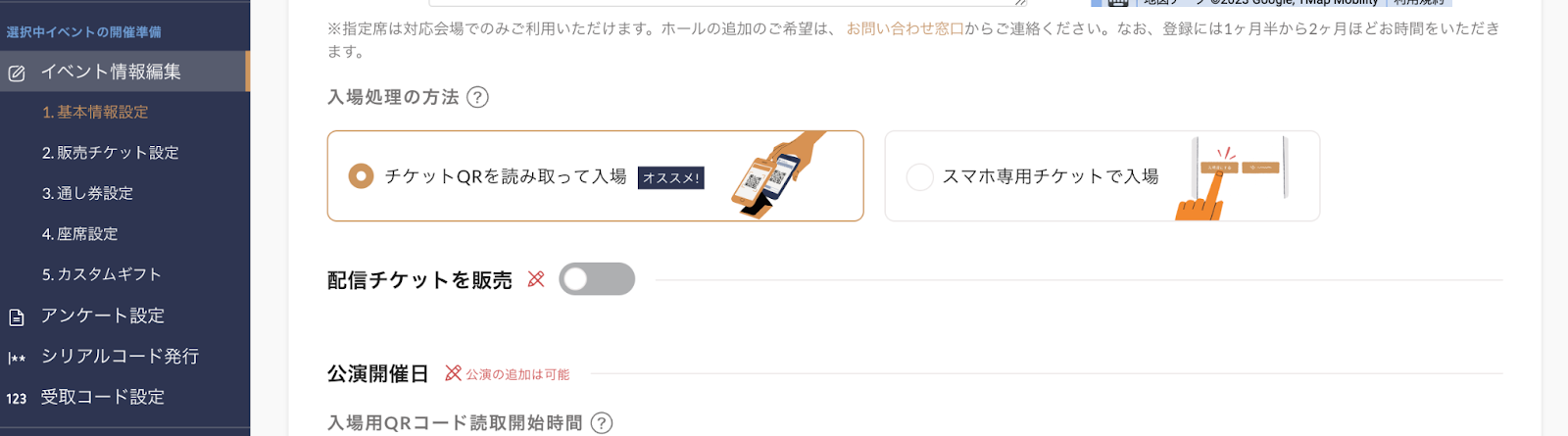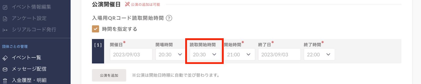 入場用QRコード読取開始時間・・・イベントページ上には表示されない「QRチケットの読取開始時刻」を設定します