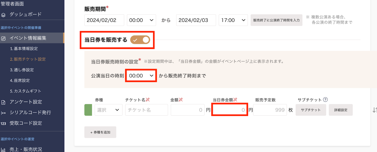 「当日券を販売する」を有効にし、前売り券と当日券それぞれの金額を設定できます。「公演当日の時刻」を設定すると、その時間以降は当日券の料金で販売できます。