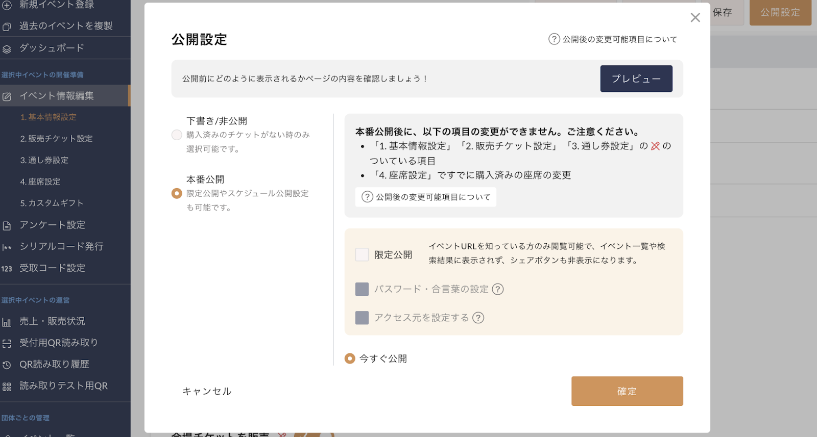 なお、イベント公開後、チケットが1枚も売れていない場合は、イベントページを未公開に戻すことができます。